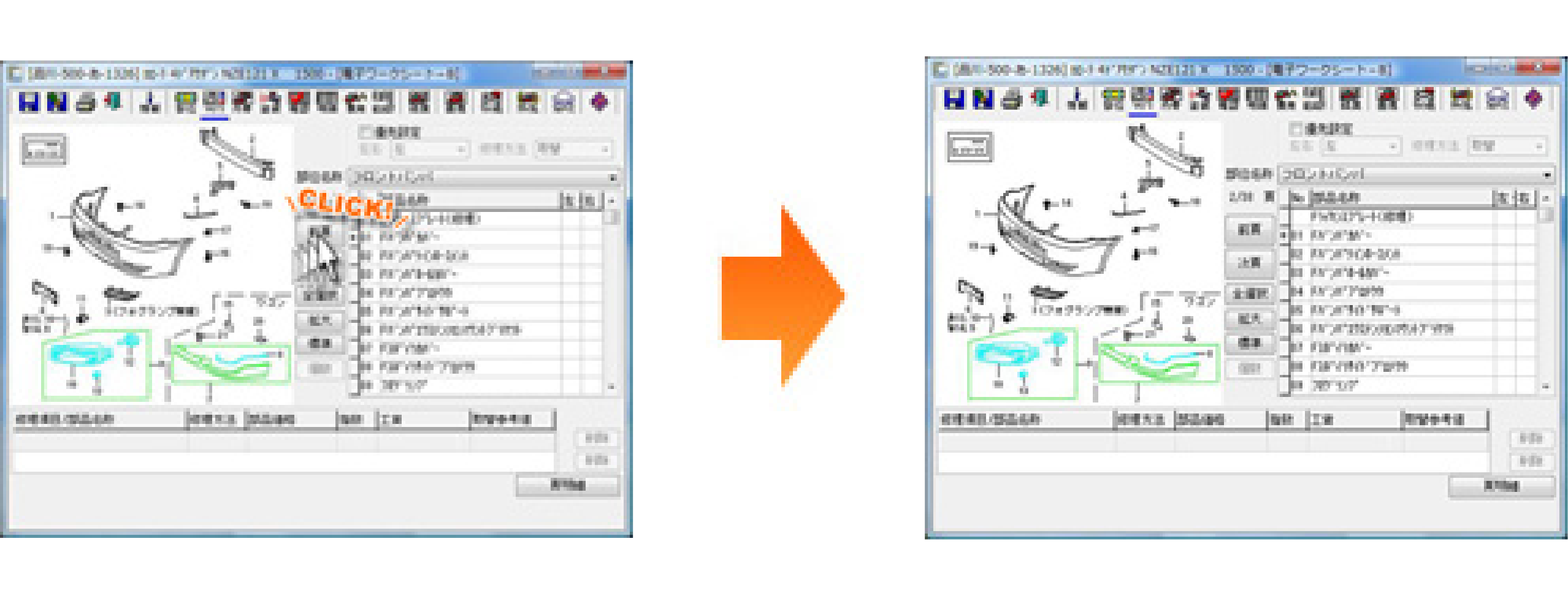 画面上に表示される部品をクリックするだけで部品名称・部品番号・部品価格・作業工賃を反映し、自動的に見積もり金額を算出。