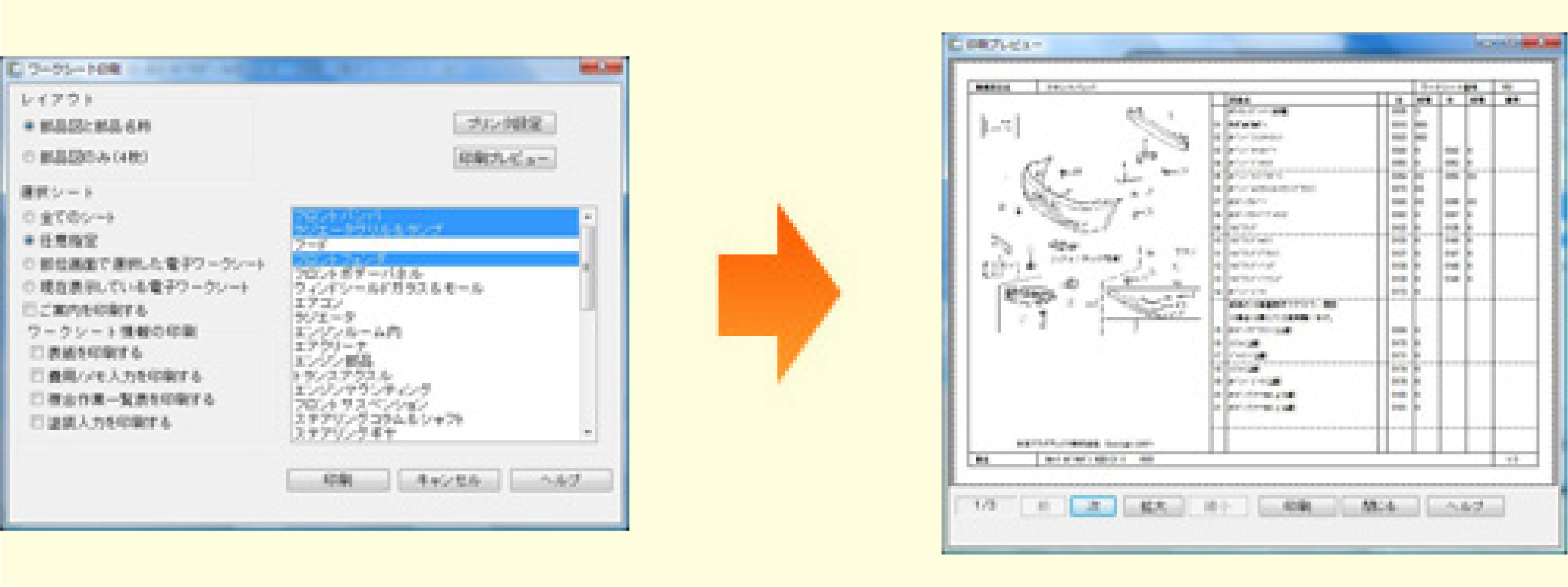 ワークシートを印刷できますので、現車のチェックに利用したり、お客さまに作業部位を伝えるためにご利用いただけます。